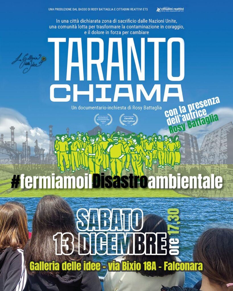 Sabato 13 dicembre ore 17:30 invitiamo ad essere presenti alla Galleria delle Idee Falconara per un incontro pubblico davvero speciale e la proiezione di "Taranto Chiama". Avremo infatti ospite Rosy Battaglia, regista del film e reporter indipendente.